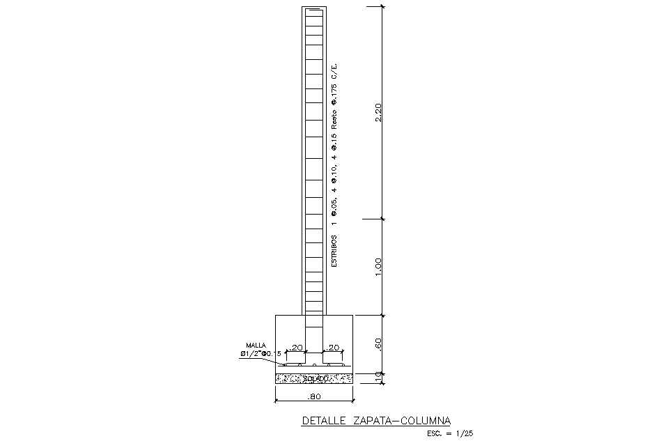 0.8m length of the column cum footing section view is given in this Autocad drawing file. Height of the column is 2.9m. Reinforcement details are specified in this drawing model. For more details download the Autocad drawing file. Thank you for downloading the Autocad drawing file and other CAD program files from our website.