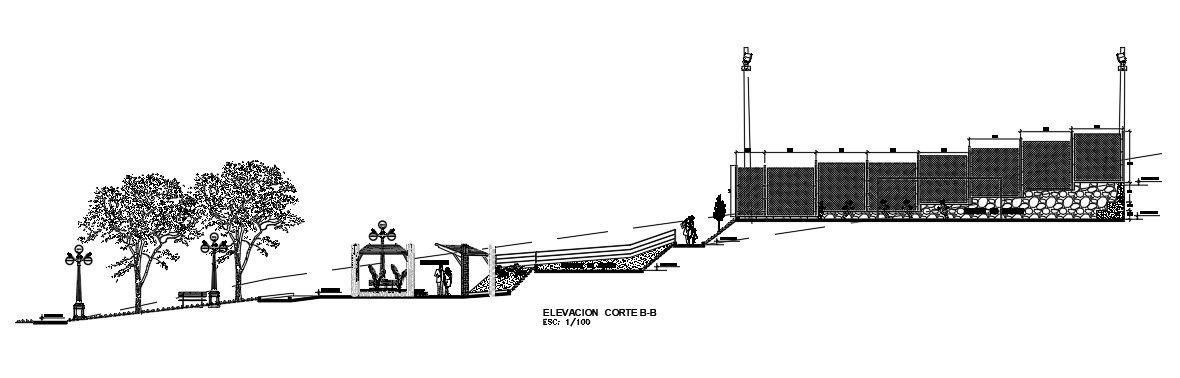 Right side elevation of 50x60m public garden cum park is given in this Autocad drawing file. Download now.