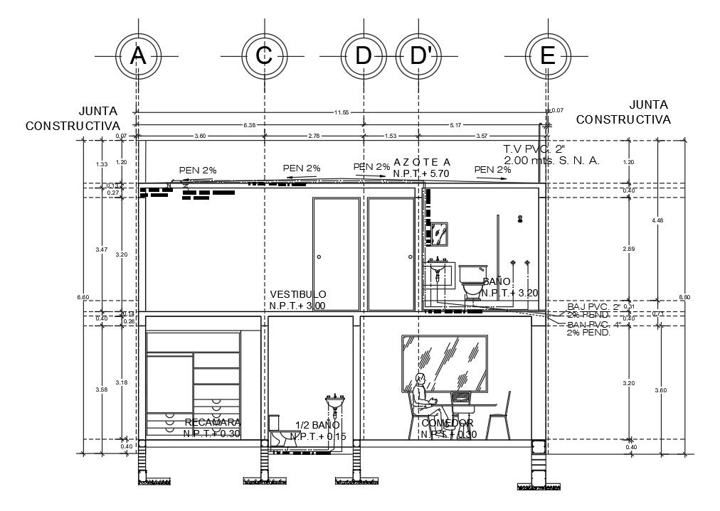 Front side section view of 12x20m home building is given in this Autocad drawing file.Download now.
