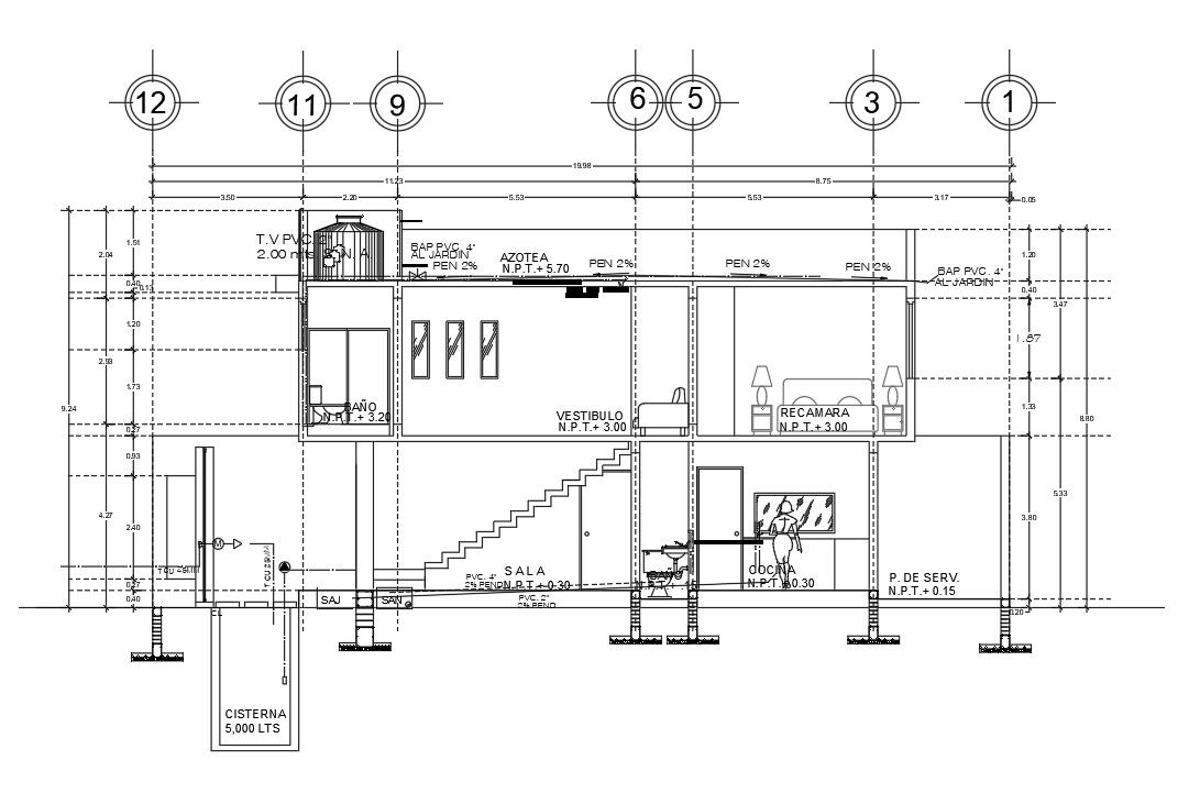 Left side section view of 12x20m home building is given in this Autocad drawing file.Download now.