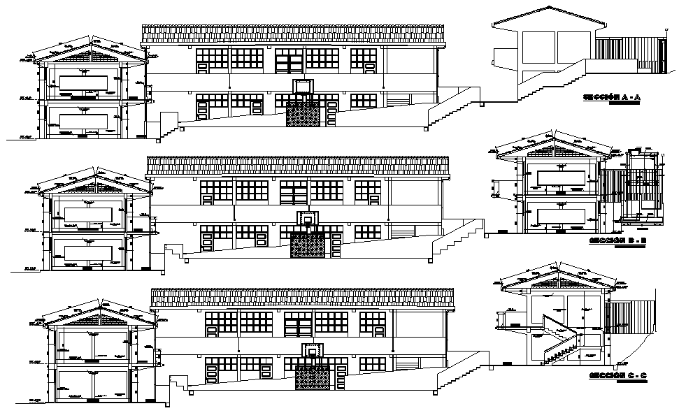 Elevation views of 50x56m college buildings are given in this Autocad drawing file.