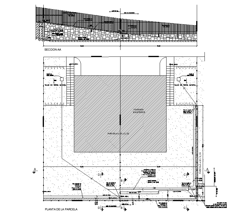 Plan cum section views of 20x20m wall layouts are given in this 2D AutoCAD DWG drawing file. This wall layout is given for plot. Centre portion is visible in this model. Plot, natural land, and other details are mentioned. For more details download the AutoCAD drawing file. Thank you for downloading the AutoCAD drawing file and other CAD program files from our website.