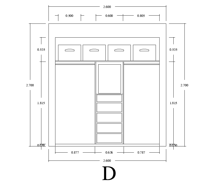 Left side section view of 4x2m dressing wardrobe is given in this Autocad drawing file. Height of the wardrobe is 2.7m. Dress hanger, shelves and locker is available in this plan. For more details download the AutoCAD drawing file. Thank you for downloading the AutoCAD drawing file and other CAD program files from our website.