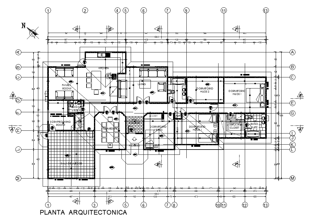 23x13m house plan is given in this Autocad drawing file. This is single house building. Kitchen, dining area, family room, living room, common bathroom, master bedroom, guest room, two kid’s room, walk in closet and common toilet is available. For more details download the AutoCAD drawing file. Thank you for downloading the AutoCAD drawing file and other CAD program files from our website.