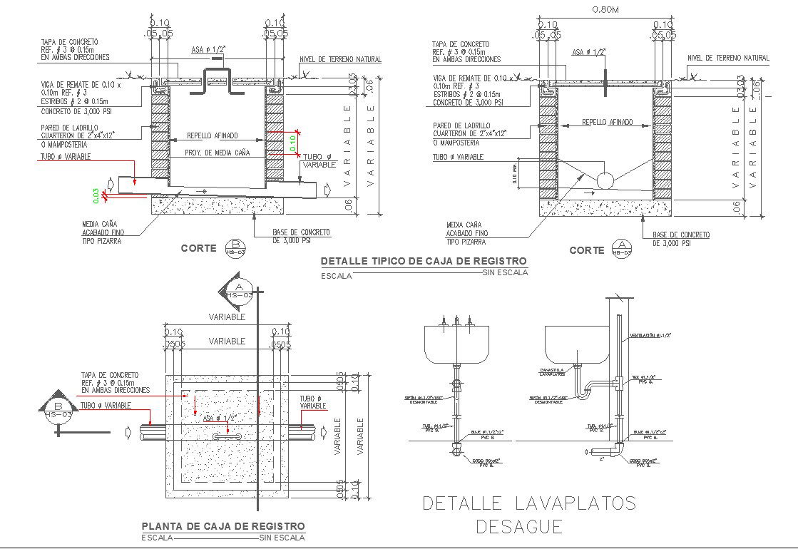 Drain box cad drawing and detail include elevations, sections and detail of drain box.