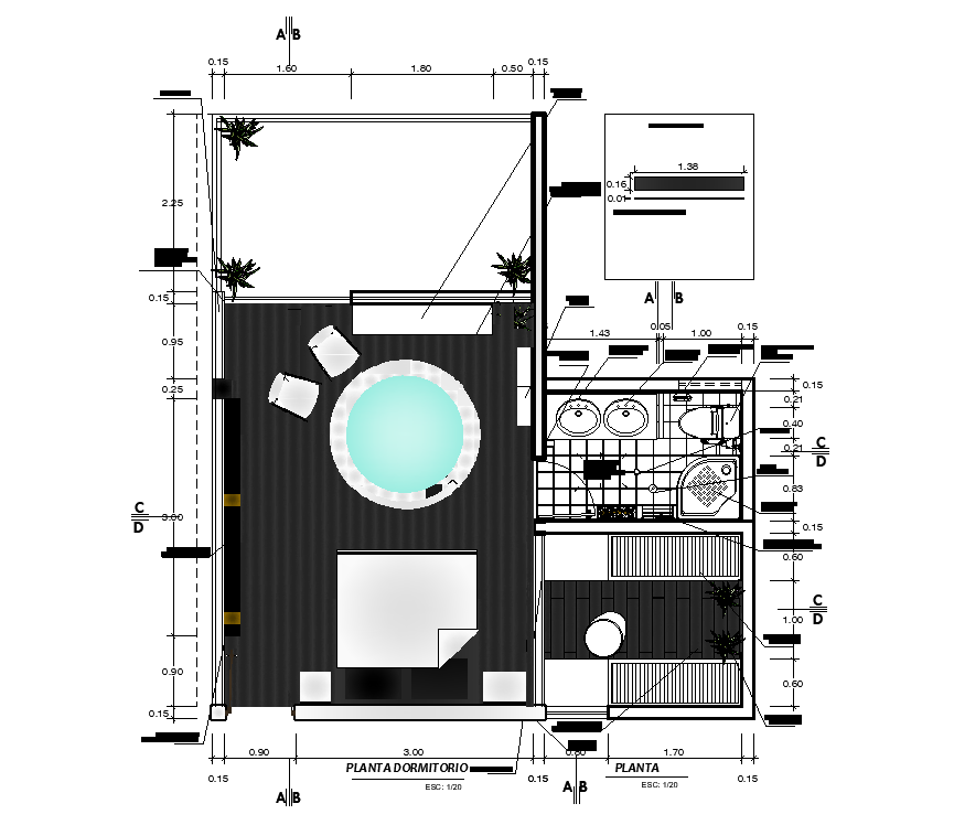 7x8m bedroom cum bathroom interior plan is given in this AutoCAD drawing model.Download now.