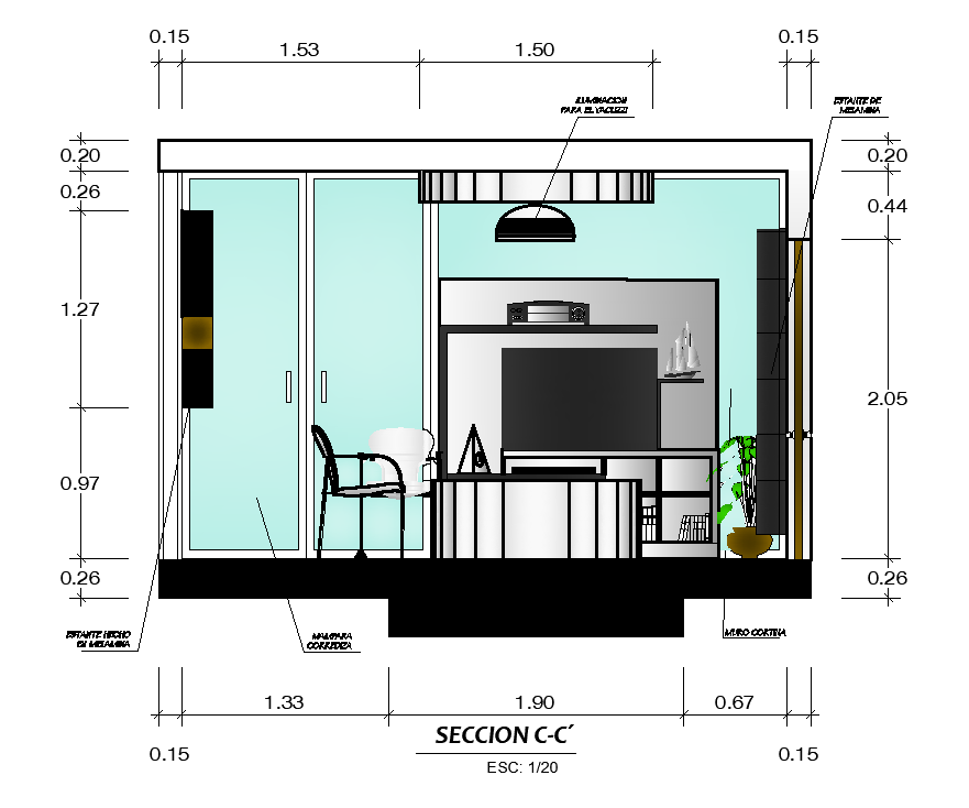 Back side section view of 7x8m bedroom interior is given in this AutoCAD drawing model. Height of the bedroom is 3m. Bed, sitting table, and balcony are available. For more details download the AutoCAD drawing file. Thank you for downloading the AutoCAD drawing file and other CAD program files from our website.