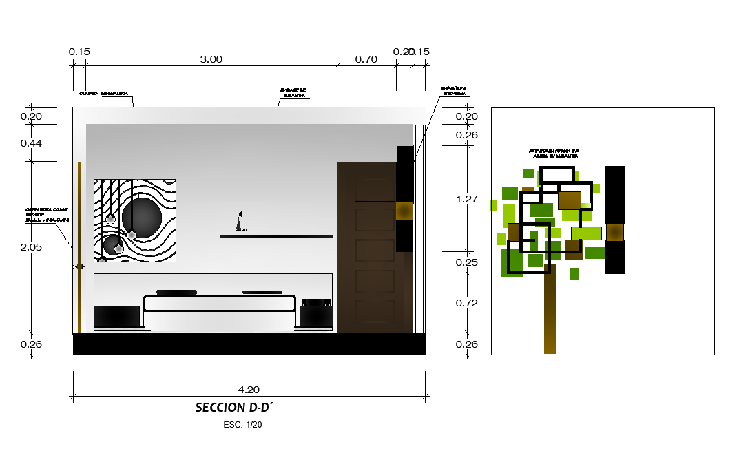 Left side section view of 7x8m bedroom interior is given in this AutoCAD drawing model. Download the Autocad model.