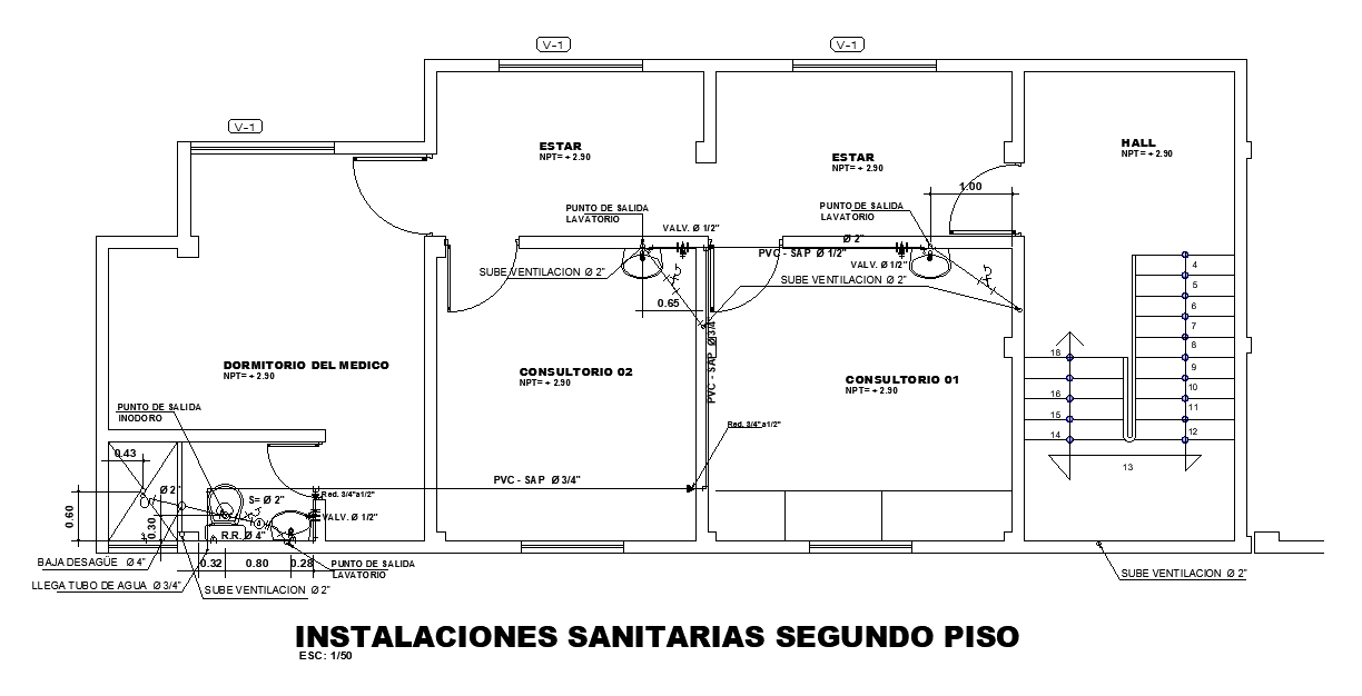 The clinic plan plot size 14X6 meter plot size space planning and sanitary facilities second floor, water pipe arrives, ventilation rises 2 ", lavatory outlet point, consultant room, doctor's bedroom, living, hall, and office detail dwg file. thank you for downloading the Autocad drawing file and other CAD program files from our website.