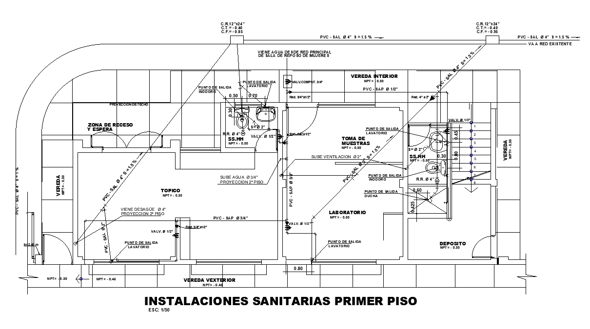 The clinic project plumbing layout plan AutoCAD drawing which consist sanitary facilities first floor, comes drainage 4 "projection 2 '' floor, ventilation goes up 2" lavatory outlet point, water comes from main network and goes to existing network with sanitary ware detail dwg file. thank you for downloading the Autocad drawing file and other CAD program files from our website.