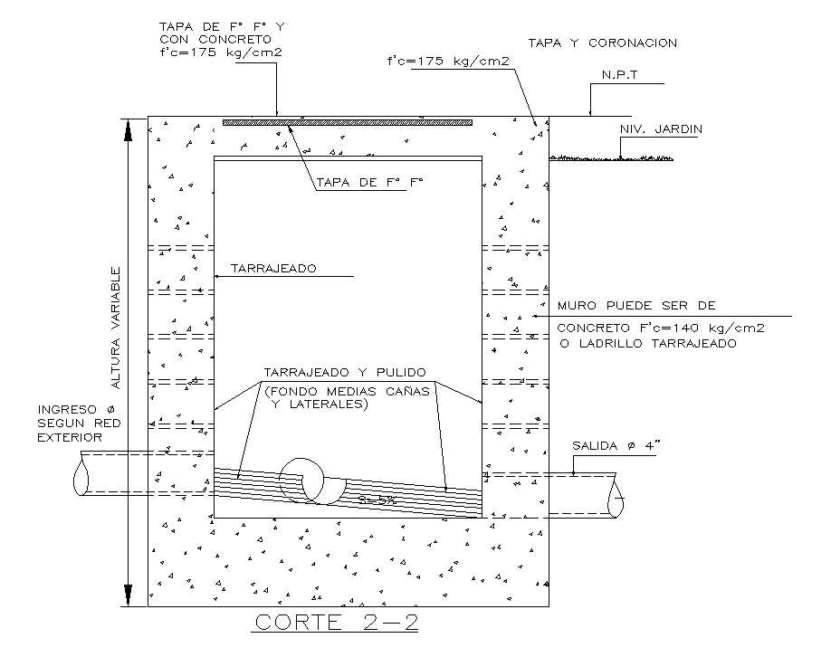 The drainage network tank section CAD drawing which consist lavatory outlet point, drainage water comes from main network and goes to existing network, carried and polished, wall can be made of, concrete f'c = 140 kg / cm2 or painted brick, and cover and coronation detail dwg file. thank you for downloading the Autocad drawing file and other CAD program files from our website.