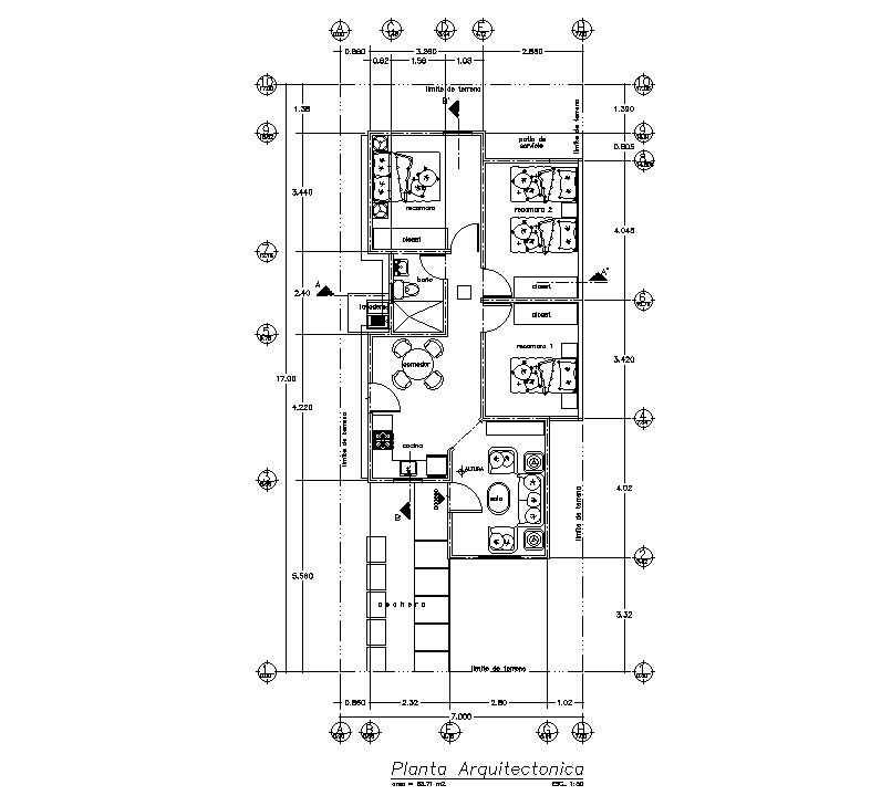 7x17m house plan is given in this AutoCAD drawing file. Download the Autocad model.