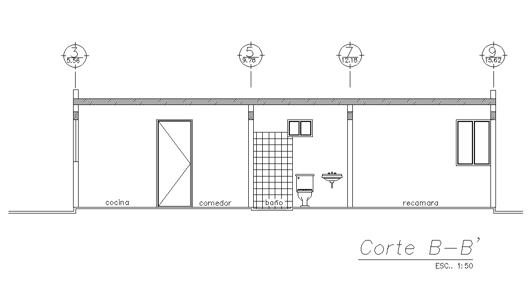 Left side elevation view of 7x17m house building is given in this AutoCAD drawing file. This is single story house building. Living hall, kitchen, dining area, access area, patio, master bedroom with attached water closet, kid’s room with attached closet, guest room and common bathroom is available. For more details download the AutoCAD drawing file. Thank you for downloading the AutoCAD drawing file and other CAD program files from our website.