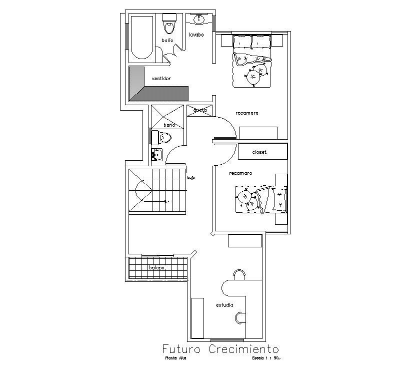 Furniture’s detail of 7x17m first floor house plan is given in this AutoCAD drawing file. This is single story house building. Study room, master bedroom with attached bathroom & bath tub, guest room with attached water closet, and common bathroom, is available. For more details download the AutoCAD drawing file. Thank you for downloading the AutoCAD drawing file and other CAD program files from our website.