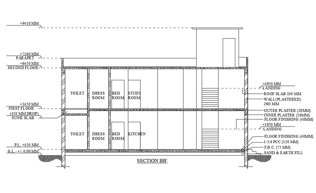 Left side section view of 17x16m house is given in this AutoCAD drawing model. This is G+ 1 house building. Living area, kitchen, dining area, guest room, kid’s room with attached balcony, master bedroom with attached bathroom & dressing room, and common bathroom is available on the ground floor. Master bedroom with attached bathroom & dressing room, balcony, study room, living area, common bathroom, and terrace is available. For more details download the AutoCAD drawing file. Thank you for downloading the AutoCAD drawing file and other CAD program files from our website.