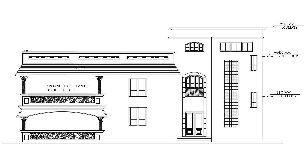 Front elevation view of 17x16m house is given in this AutoCAD drawing model.Download now.