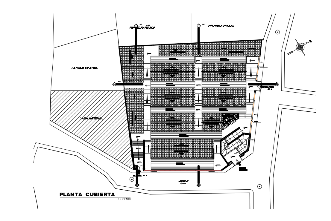 Roof plan of 42x36m snacks shop plan is given in this AutoCAD drawing model. Download the Autocad model.