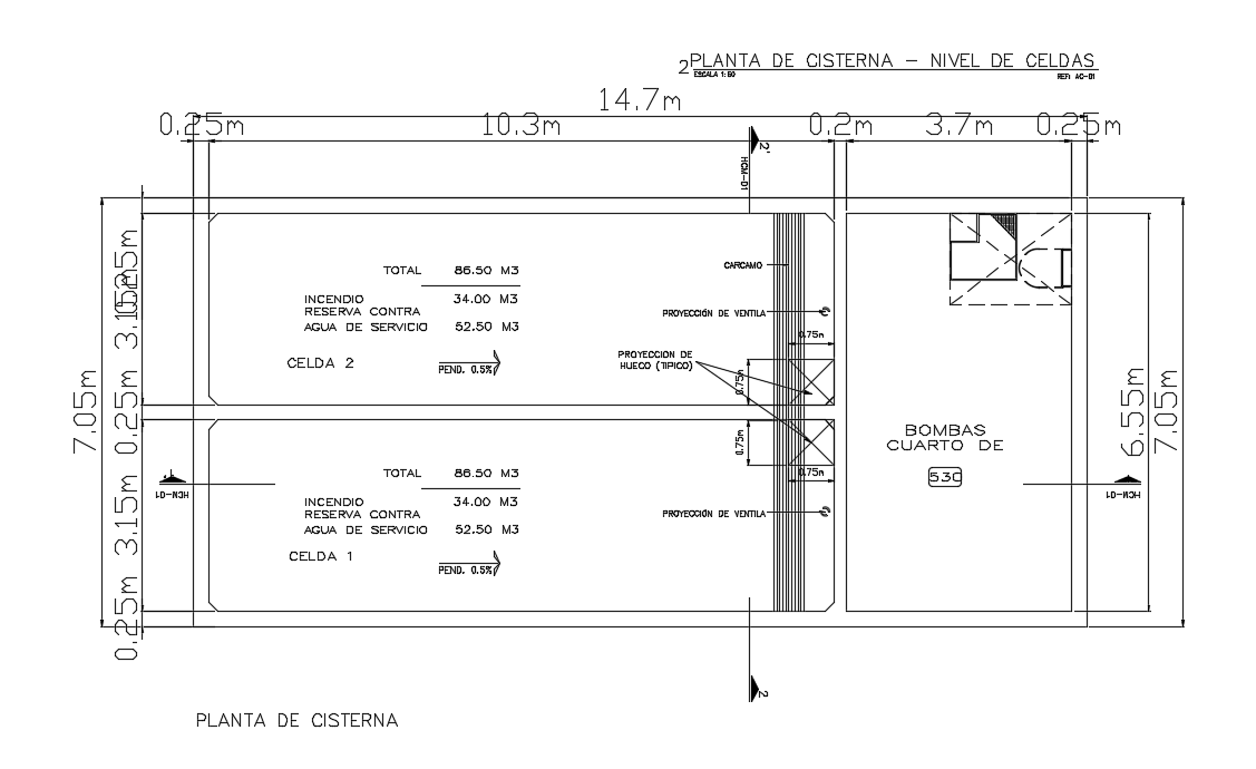 Top view of 14x7m cistern plan is given in this AutoCAD drawing model. Construction detail of the cistern is given in this AutoCAD drawing model and file. Other details are given in this plan.For more details download the AutoCAD drawing file. Thank you for downloading the AutoCAD drawing file and other CAD program files from our website.