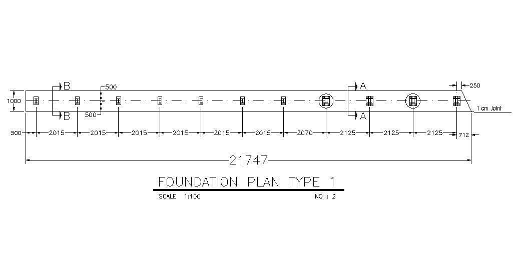 Foundation plan is given for 21m length in this AutoCAD drawing model. The length of the each foundation is 2m. The dimension of the column cross section is 250x500mm. For more details download the AutoCAD drawing file. Thank you for downloading the AutoCAD drawing file and other CAD program files from our website.