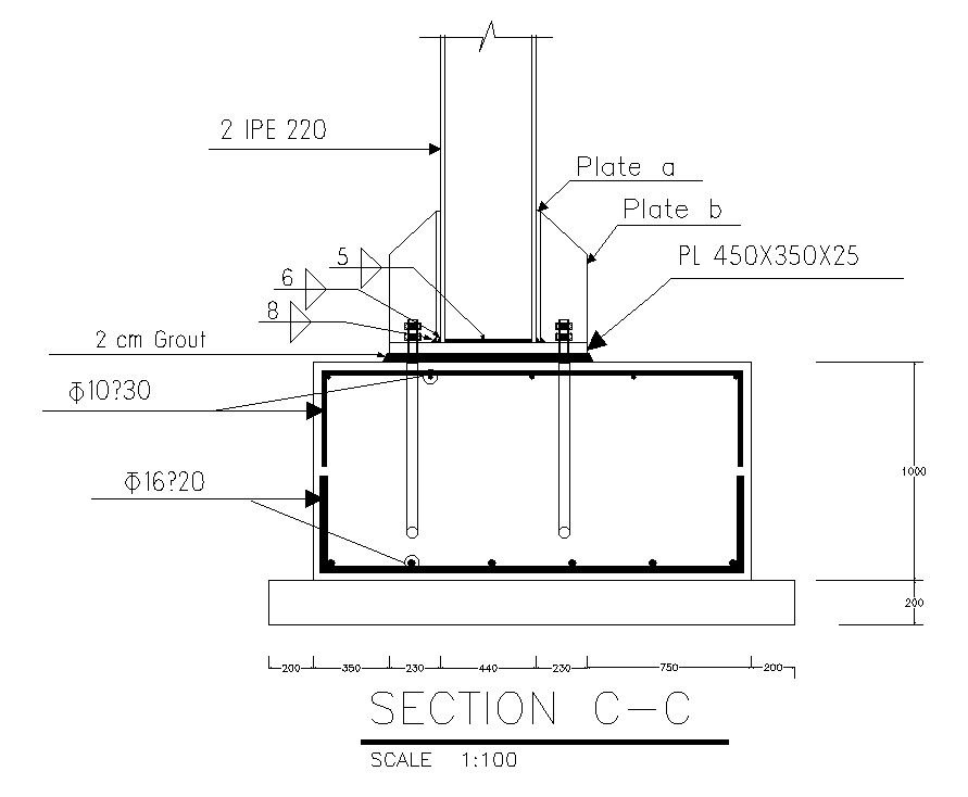 A section view of 150x200mm base plate with column is given in this AutoCAD drawing model. The dimension of I section is 400x200x20mm. This plan and section view is given with 1:50 scale. For more details download the AutoCAD drawing file. Thank you for downloading the AutoCAD drawing file and other CAD program files from our website.