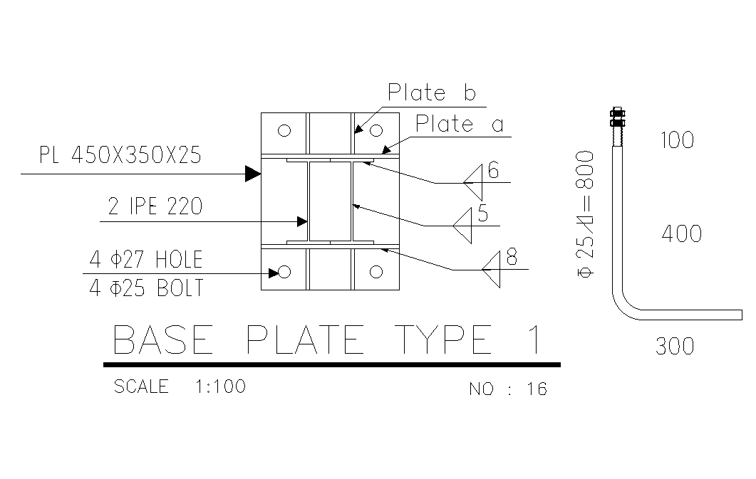 700x600mm base plate components are given in this AutoCAD drawing model. The dimension of I section is 450x350x25mm. 4 numbers of bolts, 27mm dia of 4 numbers of hole, and plates are visible in this model. Measurement details are given in this model. For more details download the AutoCAD drawing file. Thank you for downloading the AutoCAD drawing file and other CAD program files from our website.