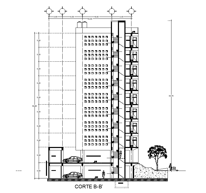 Right side section view of 20x27m apartment building is given in this AutoCAD drawing model. Download now.