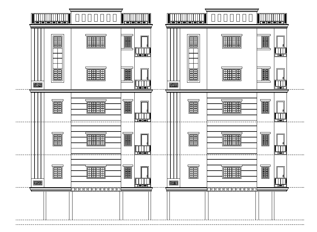 The back side elevation view of the 82’x74’ residential apartment building is given in this AutoCAD drawing model. This is G+ 5 apartment building. On each floor, four houses are available. These houses are consist of a kitchen, hall cum dining area, utility room, puja room, drawing room, master bedroom with attached toilet, guest room, kid’s room, and common bathroom are available. For more details download the AutoCAD drawing file. Thank you for downloading the AutoCAD drawing file and other CAD program files from our website.