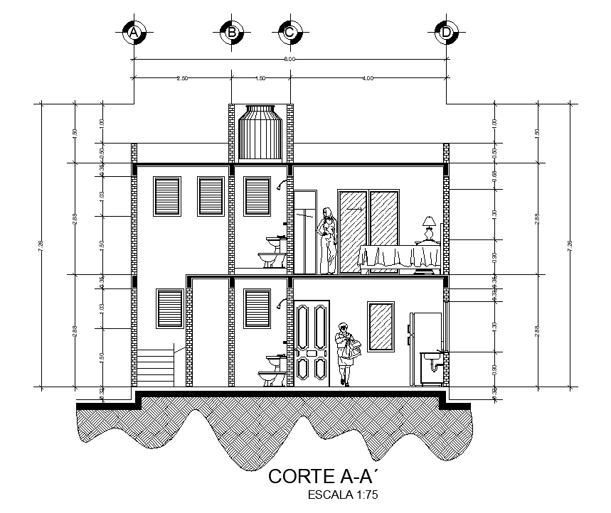 Back side section view of 8x10m house building is given in this AutoCAD drawing model.Download now.