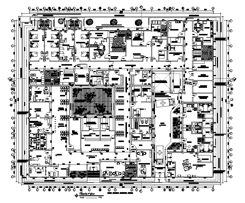 47x40m hospital ground floor plan is given in this AutoCAD drawing model. Download now.