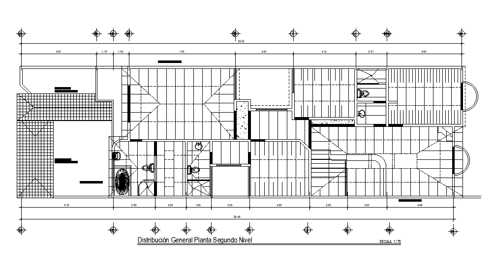 General distribution of first floor level of 40x11m house plan is given in this AutoCAD drawing model.Download now.