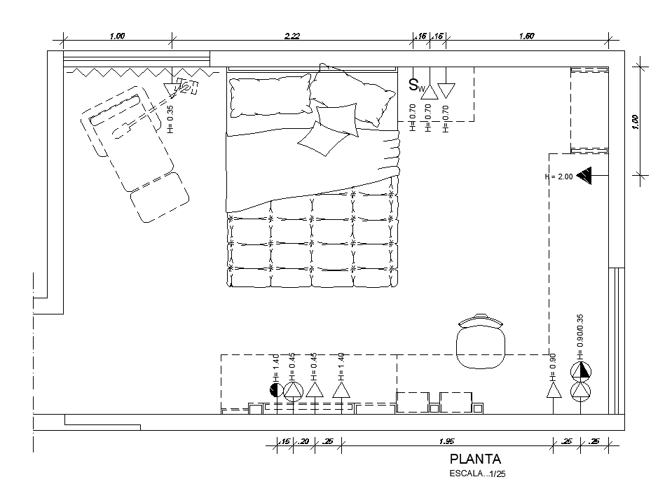 Furniture’s layout of 15’x10’ bedroom plan is given in this AutoCAD drawing. Total height of the bedroom is 2.6m. One bed, study table, and computer table is available. For more details download the AutoCAD file. Thank you for downloading the AutoCAD file and other CAD program files from our website.