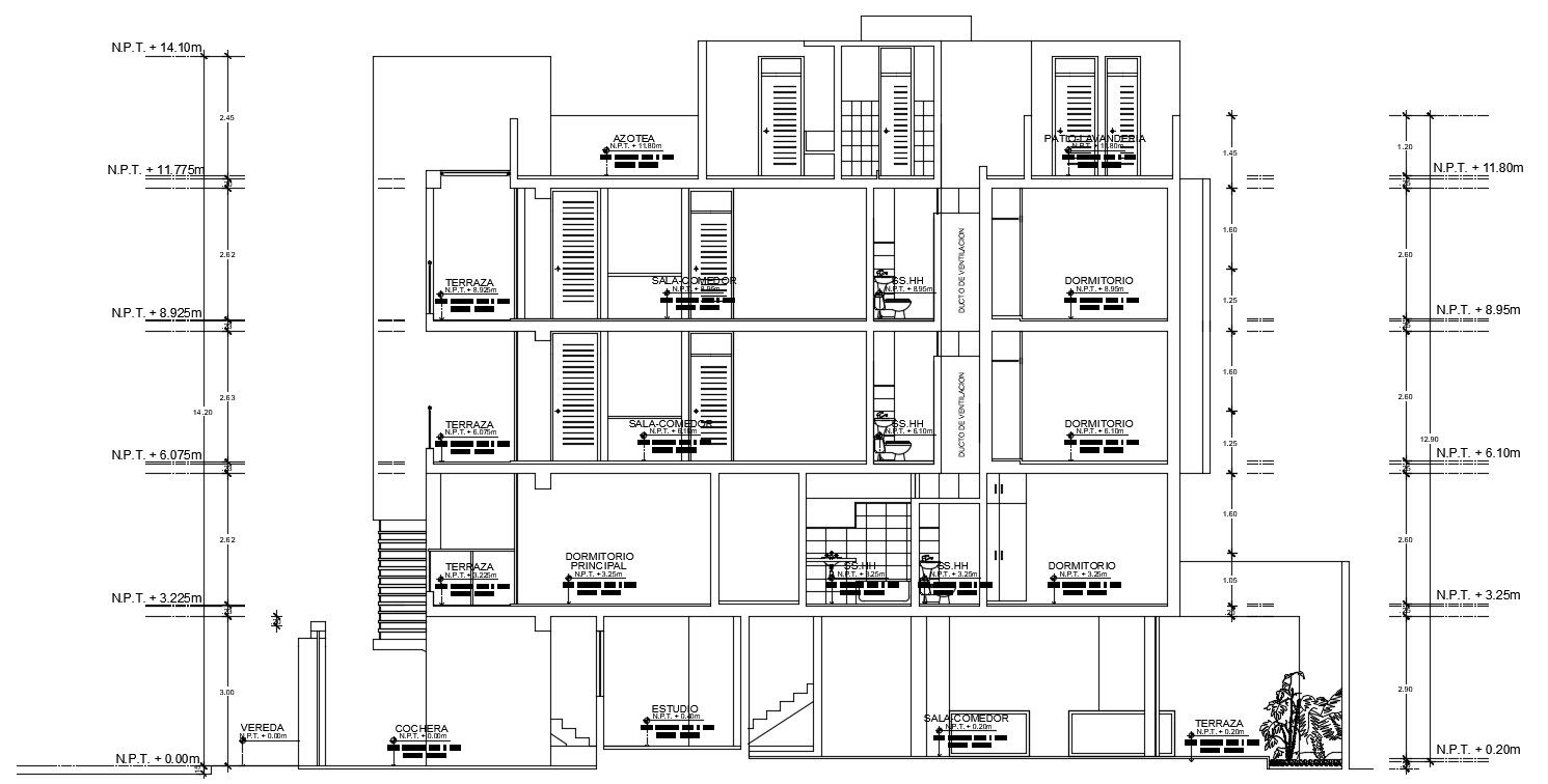 Right side section view of 8x21m house building is given in this 2D AutoCAD file. This is G+ 3 duplex house building. Car parking, store room, kitchen, lavenderia, hall, dining area, study room, and common bathroom are available on the ground floor. Master bedroom with attached bathroom, kid’s room with attached bathroom, two guest room with attached toilets, and staircase are available on the 2nd, 3rd, and 4th floors. Sown grass is spread grass. For more details download the AutoCAD file. Thank you for downloading the AutoCAD file and other CAD program files from our website.