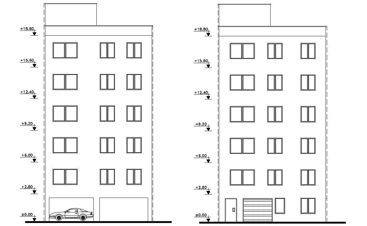 An elevation view of 11x20m apartment building is given in this AutoCAD drawing model.Download now.