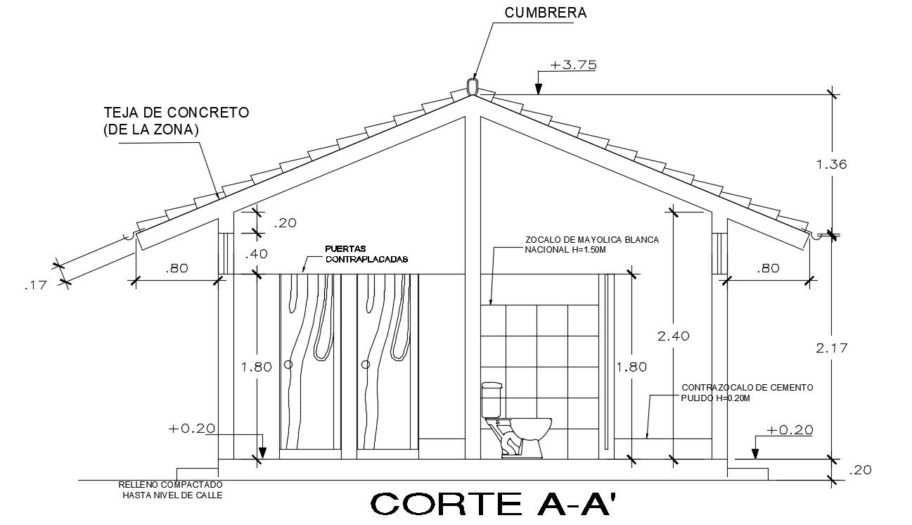 Front section view of 5x8m toilet building is given in this AutoCAD drawing model. Total height of the toilet building is 3.5m. Gent’s and ladies toilets are provided separately. For more details download the AutoCAD file. Thank you for downloading the AutoCAD file and other CAD program files from our website.