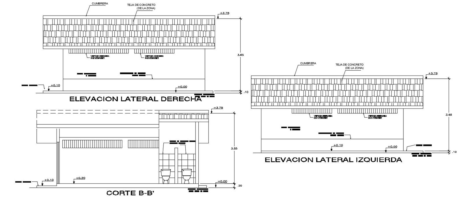 Left side section and elevation view of 5x8m toilet building is given in this AutoCAD drawing model. Download the Autocadmodel.