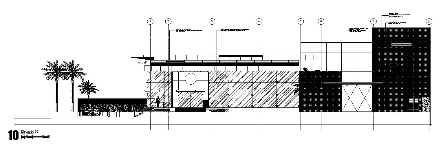 Left side elevation view of 182x102m shopping mall plan is given in this AutoCAD model.Download now.