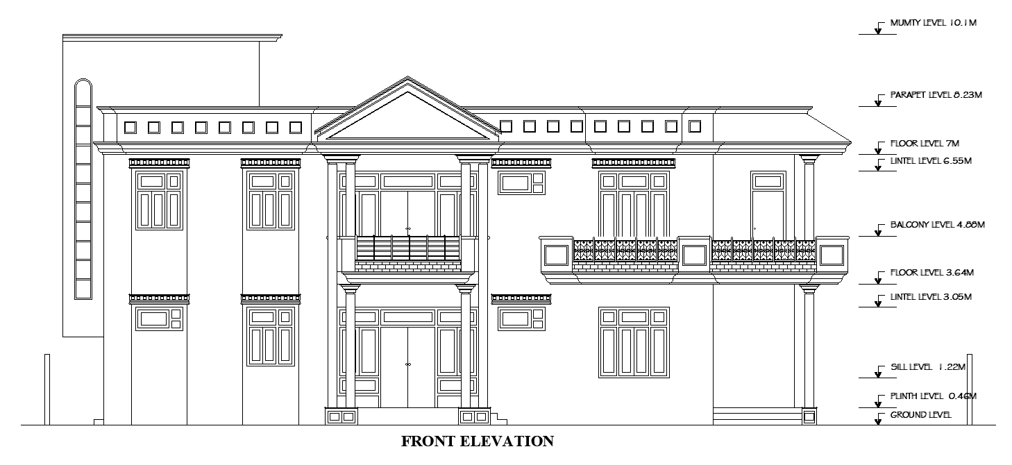 Front side elevation view of 12x8m villa building has been given in this AutoCAD drawing model. This is G+ 1 house building. Kitchen, store room, puja room, lobby, wash area, drawing area, verandah, master bedroom with attached bathroom, kid’s room, guest room, and common bathroom are available on the ground floor. Drawing room, dining hall, servant room, kitchen, balcony, master bedroom, kid’s room, guest room, and common bathroom are available.For more details download the AutoCAD drawing file. Thank you for downloading the AutoCAD drawing file and other CAD program files from our website.