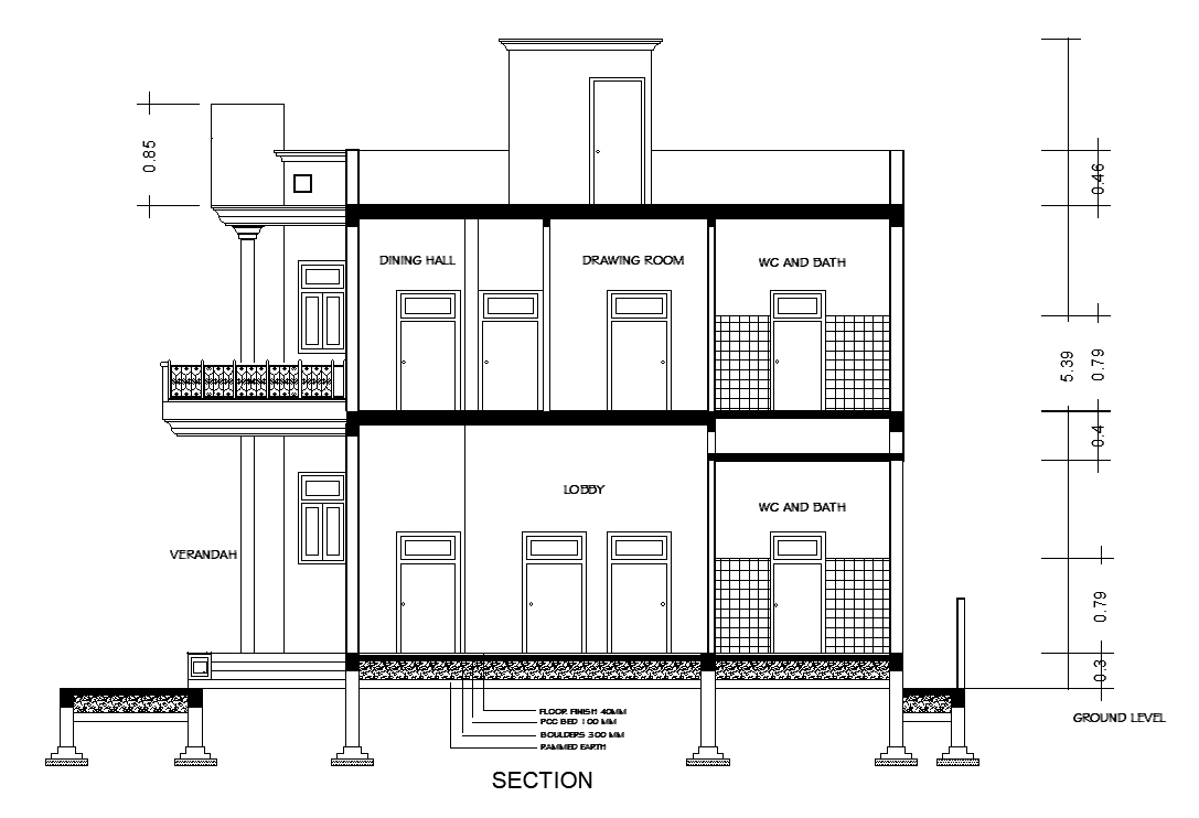 Front section view of 12x8m villa building is given in this AutoCAD drawing model. This is G+ 1 house building. Kitchen, store room, puja room, lobby, wash area, drawing area, verandah, master bedroom with attached bathroom, kid’s room, guest room, and common bathroom are available on the ground floor. Drawing room, dining hall, servant room, kitchen, balcony, master bedroom, kid’s room, guest room, and common bathroom are available.For more details download the AutoCAD drawing file. Thank you for downloading the AutoCAD drawing file and other CAD program files from our website.