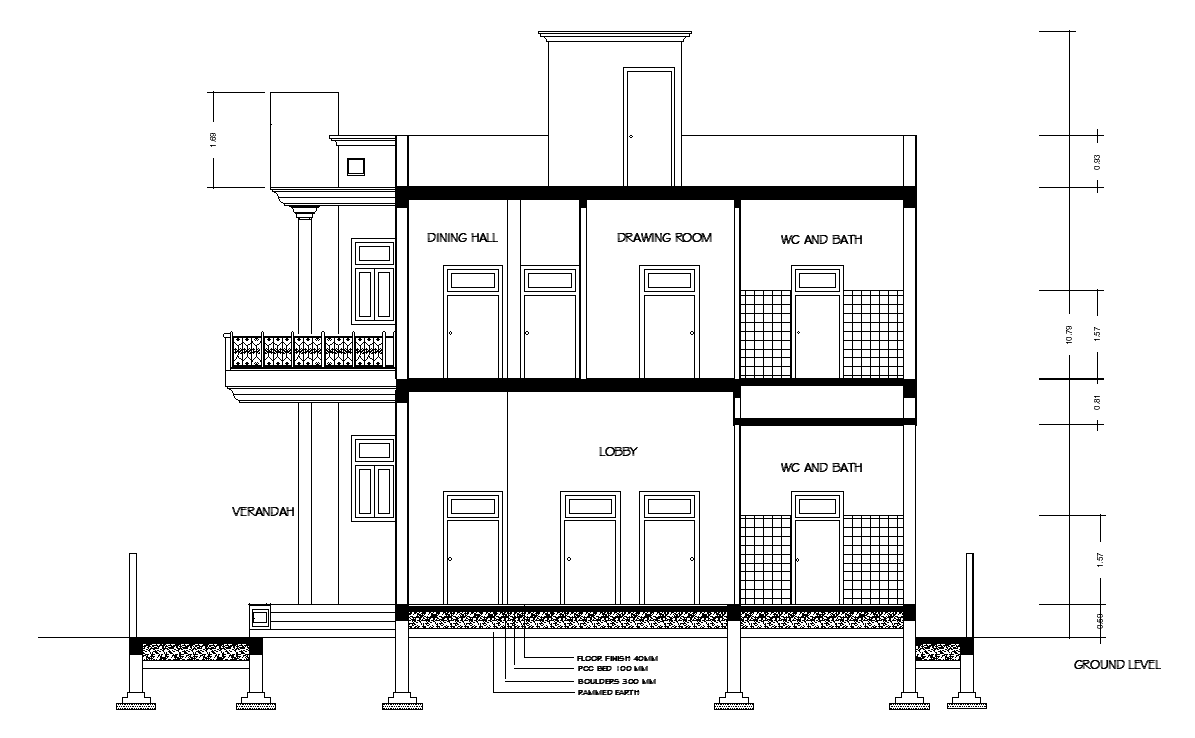 Left side section view of 12x8m villa building is given in this AutoCAD drawing model. This is G+ 1 house building. Kitchen, store room, puja room, lobby, wash area, drawing area, verandah, master bedroom with attached bathroom, kid’s room, guest room, and common bathroom are available on the ground floor. Drawing room, dining hall, servant room, kitchen, balcony, master bedroom, kid’s room, guest room, and common bathroom are available.For more details download the AutoCAD drawing file. Thank you for downloading the AutoCAD drawing file and other CAD program files from our website.