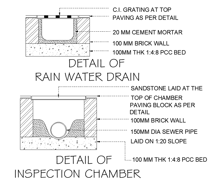 12x8m house plan of rain water drain detail drawing is given in this AutoCAD model. Detail of inspection chamber is given in this model. 150mm diameter of sewer pipe is provided. For more details download the AutoCAD drawing file. Thank you for downloading the AutoCAD drawing file and other CAD program files from our website.