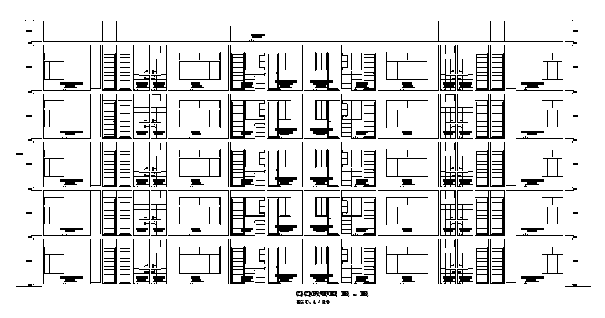 Front section view of 28x17m apartment building is given in this AutoCAD model. Download now.
