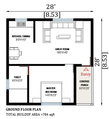 28'x28' small single floor tiled roof home design is given in this cad file. The total built-up area of the plan is 784 sqft. On this ground floor plan, a master bedroom with an attached toilet, a great room, a kitchen with dining, and a covered porch is available. Download the free 2D Autocad drawing file.