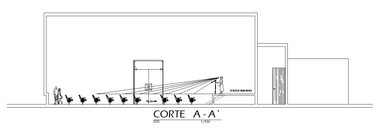 Front section view of 90x39m community center of auditorium is given in this AutoCAD model. Download now.