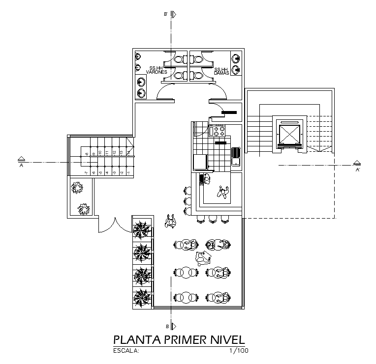 90x39m community center of cafeteria plan is given in this AutoCAD model. Download now.