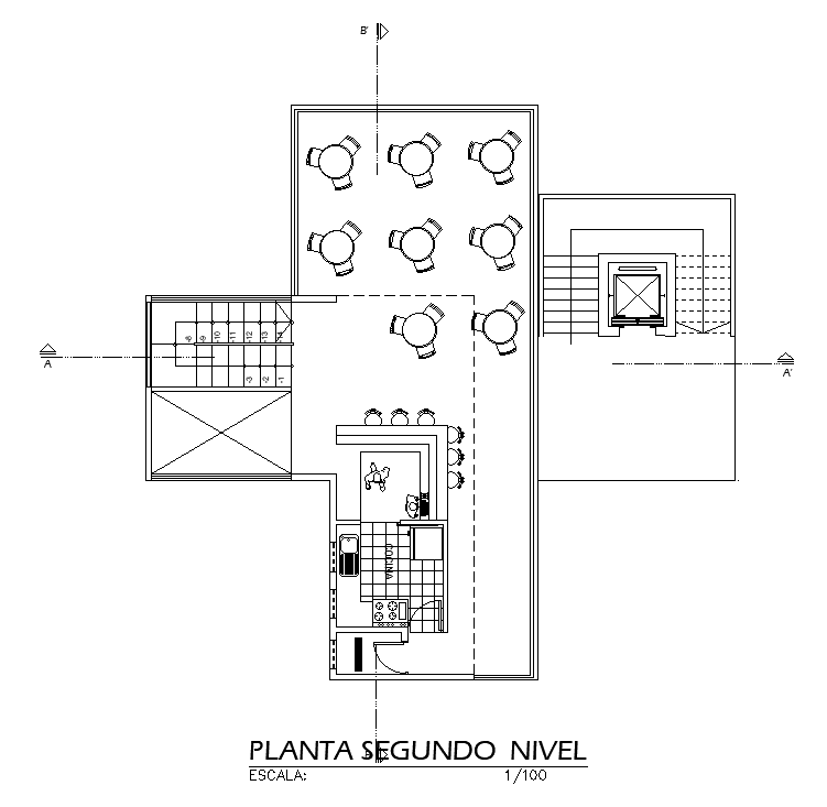 90x39m community center second floor of cafeteria plan is given in this AutoCAD model. Download now.