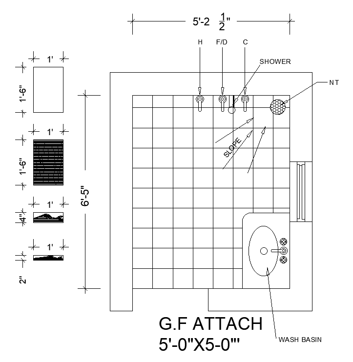 5’x5’ bathroom plan is given in this AutoCAD drawing model. The height of the bathroom building is 3m. Wash basin, shower, hand shower, and taps are available. For more details download the AutoCAD drawing file. Thank you for downloading the AutoCAD drawing file and other CAD program files from our website.