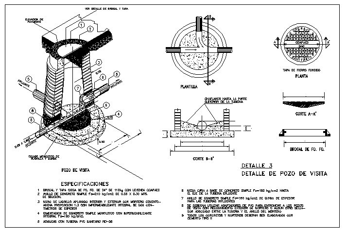 Sewer hole cover detail cad file. Chambers to the side Top of the pipe, Brocal and blind fo cap. Fo. Of 24 "of 110kg with legend coper detail.