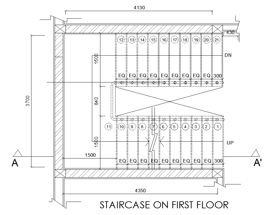 13x15m house plan of first floor staircase plan is given in this AutoCAD model. The length and breadth of the staircase is 4130x3700mm. 230mm thickness of external wall is provided. For more details download the AutoCAD drawing file. Thank you for downloading the AutoCAD drawing file and other CAD program files from our website.