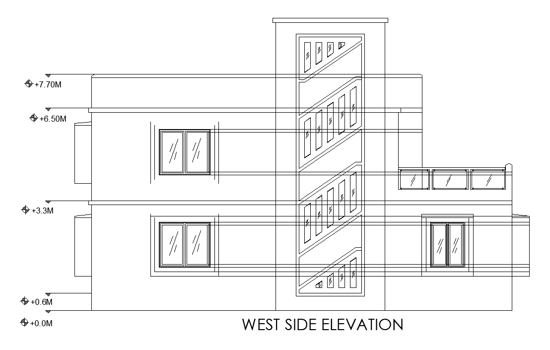 West side elevation view of 13x15m house building has been given in this AutoCAD model. This is G+ 1 residential house building. Kitchen, living area, study room, dining area, master bedroom with attached bathroom, kid’s room with attached bathroom, and staircase are available. Family lounge area, terrace, master bedroom with attached bathroom, and guest room with attached bathroom are available on the first floor. For more details download the AutoCAD drawing file. Thank you for downloading the AutoCAD drawing file and other CAD program files from our website.