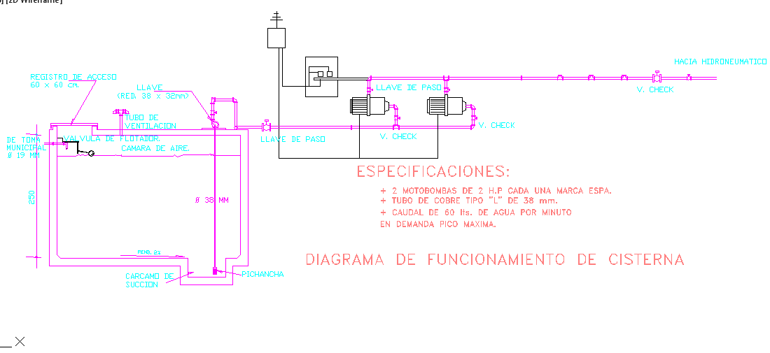 underground water cistern Design. + 2 OF 2 H.P EACH BRAND ESPA.+ FLOW OF 60 lts. OF WATER PER MINUTE, Hydrolic pipe detail, Floating Valve.